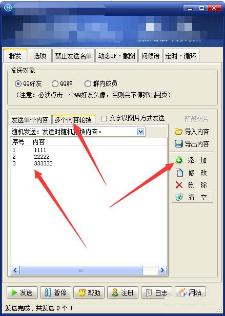 4、单个内容发送为牢固一条信息发送,而多个内容开启轮换发送为多条内容开启轮回发送;